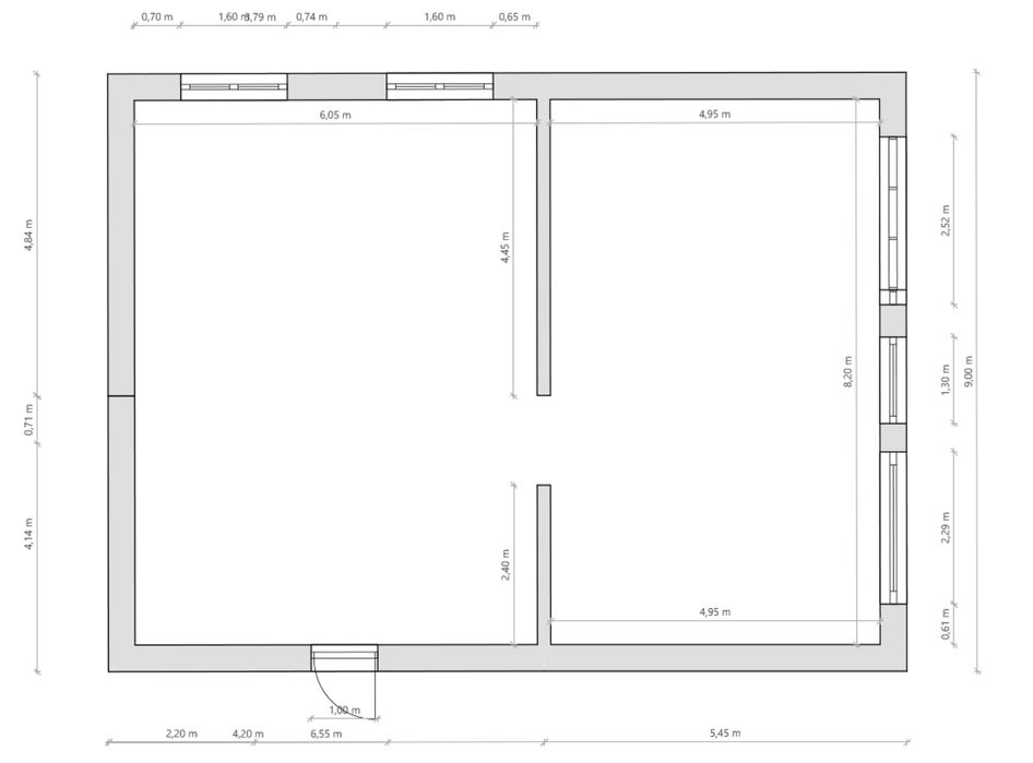 Розміри 9 на 12 м, висота стелі 3 м.