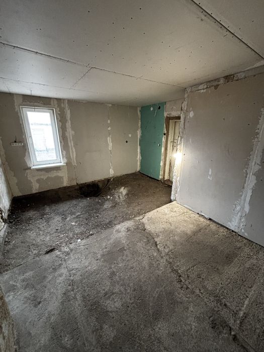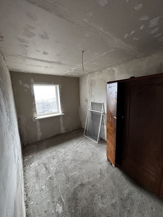 В хаті скрізь нова провода, не скрізь підключена, стіни обшиті гіпсокартоном, поли в 4 кімнатах залиті, в двух маленьких, у великій залито до половини, так як там планувалась різна висота, труба на воду заведена в хату і проведена до колонки, труба під злив не виведена і ями немає, цим треба займатись. Мається груба для топки дровами.