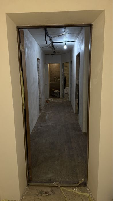 Лінолеум (встигли покласти в двох кімнатах і коридорі, на інші кімнати просто лежить відрізаний)