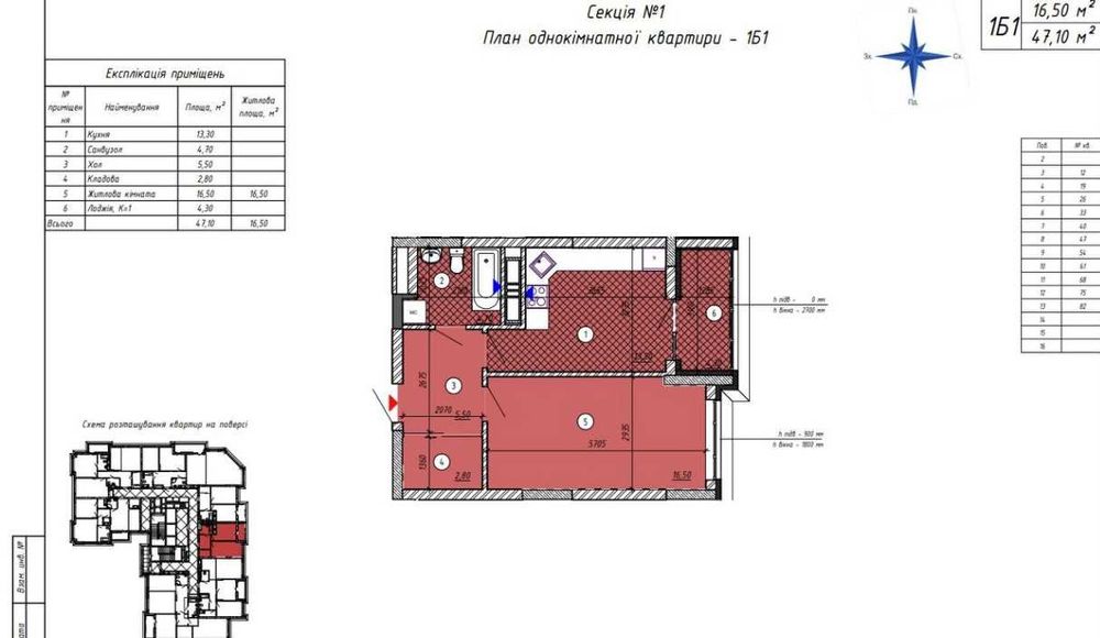 Загальна площа 47, 10 м2. 11 поверх. 85.000 $. Торг.