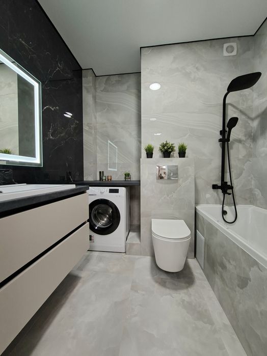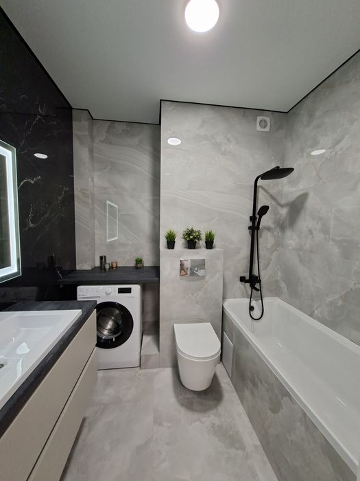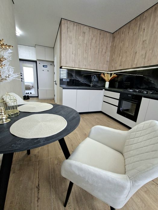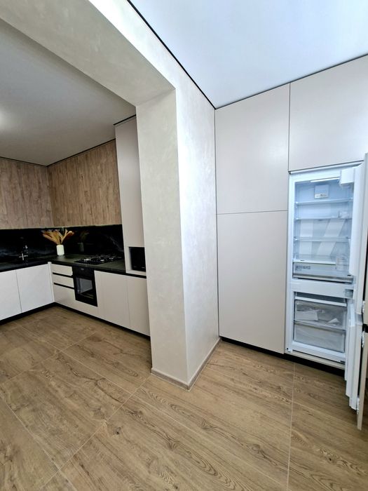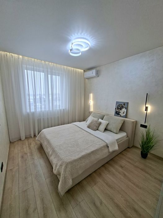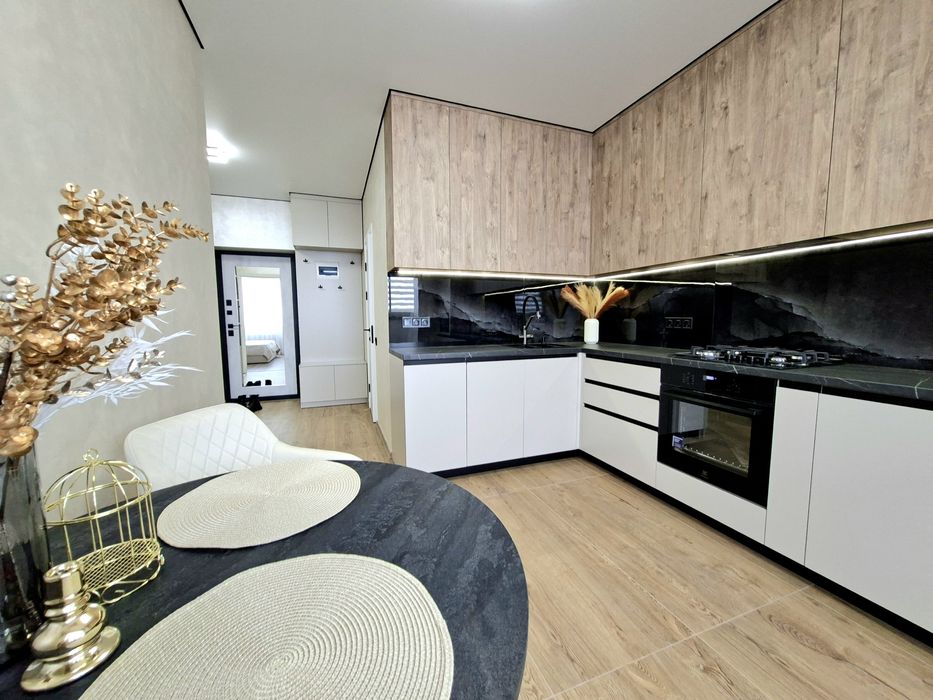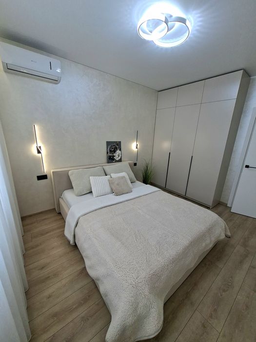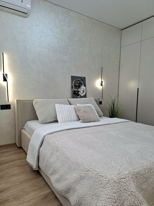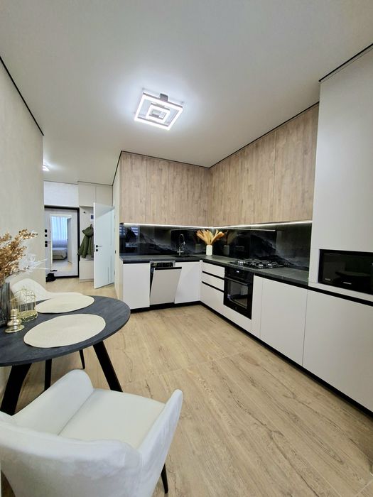 Квартира укомплектована всією необхідною технікою та меблями для комфортного проживання, а саме : Вбудована кухня з витяжкою, газова варочна поверхня, духова шафа, мікрохвильова піч, посудомийна машина, вбудований холодильник, стіл та стільці, розкладний двухспальний диван, двоспальне ліжко з підйомним механізмом, простора шафа з підсвіткою, встановлений інверторний кондиціонер, пральна машина, телевізор зі смарт TV.