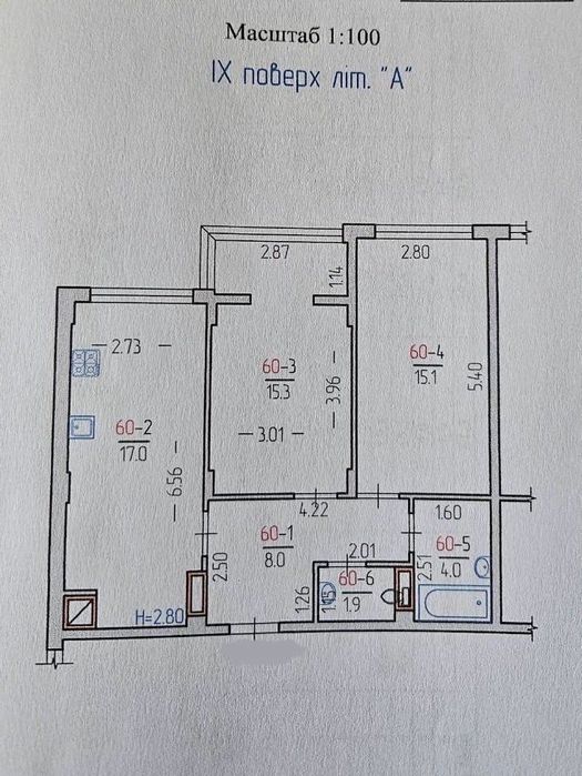 площа 61 м2, житлова 30,4 м2, кухня 17 м2