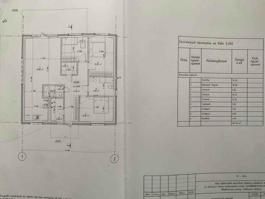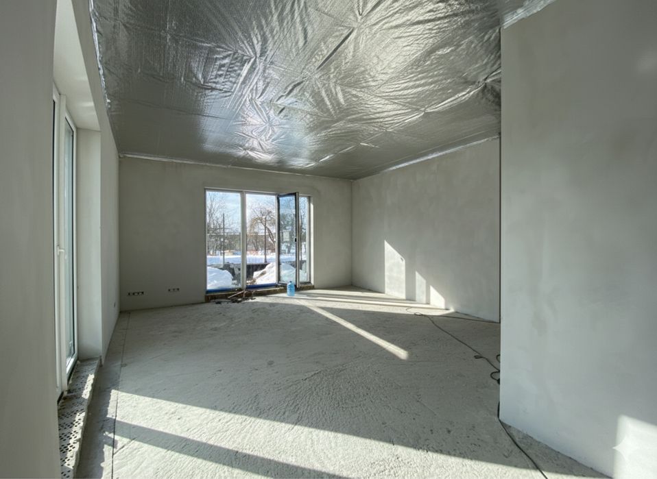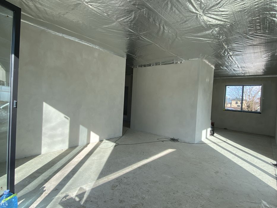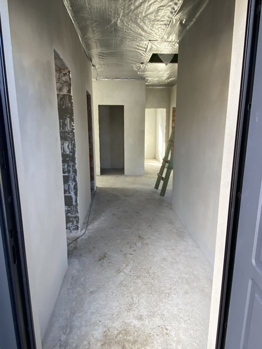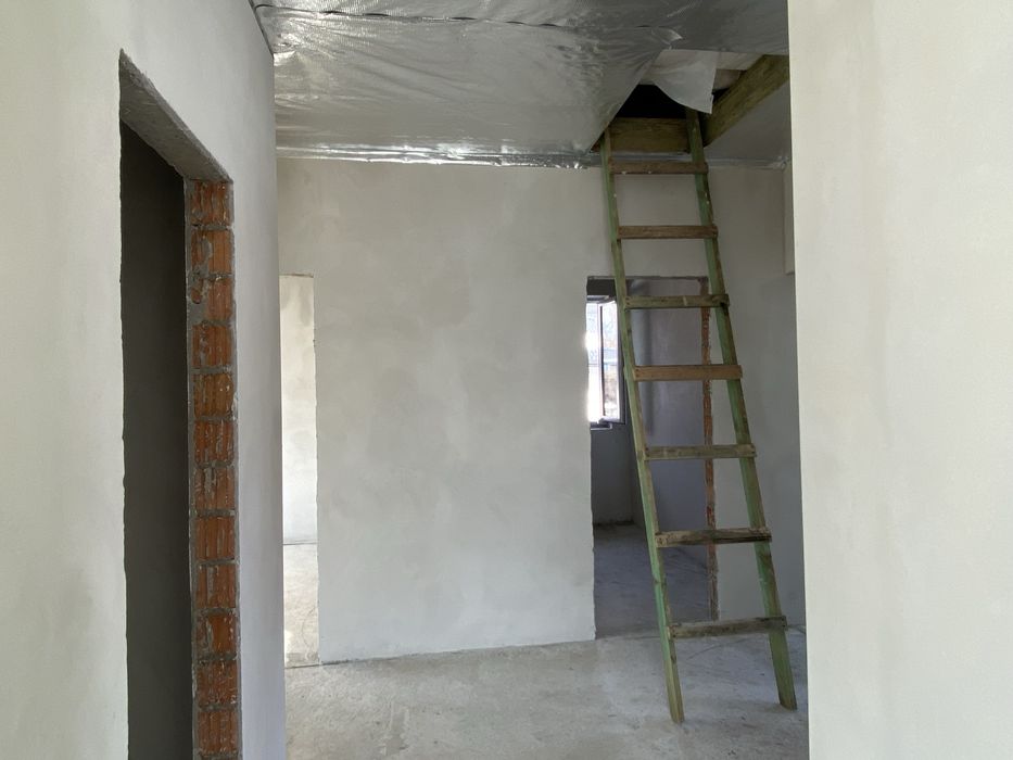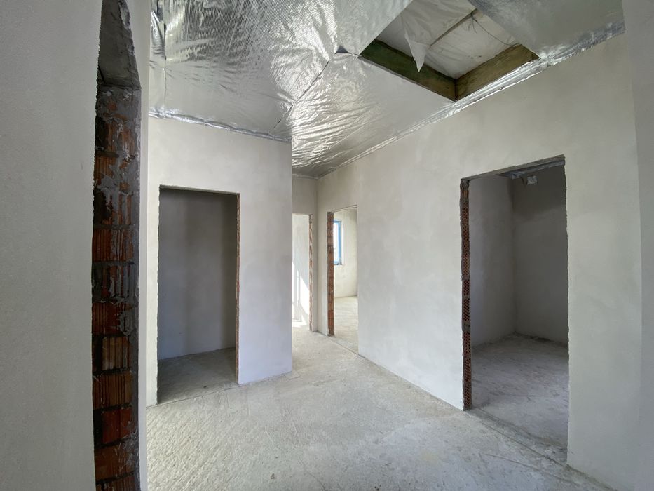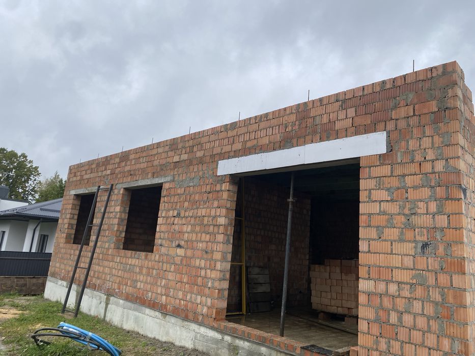 Стіни з подвійної цегли (керамоблоку), повністю поштукатурені та зроблені відкоси. Висота до стелі 3м. Якісно змонтований дах, та перекриття. Проведено монтаж армовано-фольгованого паробарєру. Є власне горище. Накритий будинок польським металопрофілем Т18, Дахова мембрана Strotex-Q Supreme 170г/м.,водостічна система Bryza. Зроблено підшивку звисів даху, та встановлені вуличні віконні відливи (підвіконники).