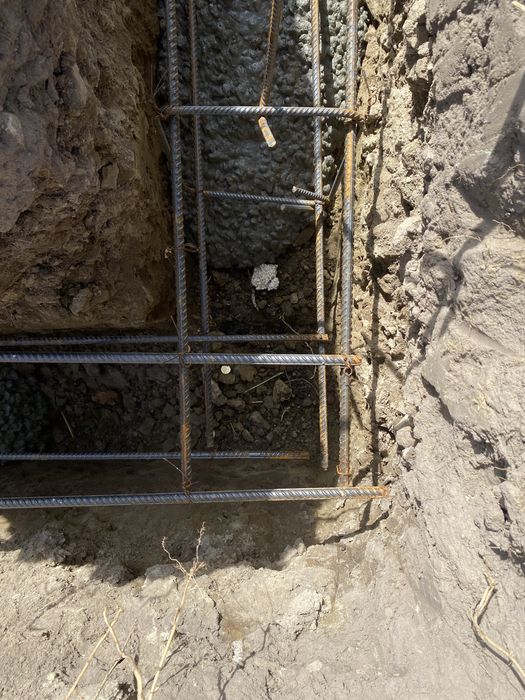 Фундамент монолітний стрічковий, бетон - м300, проармований арматурними каркасами, як в землі так і над, глибина від 80 до 90см, ширина 40см. Плита 17см. також монолітна, армована з арматури 10 та 12мм. + сітка 4мм.