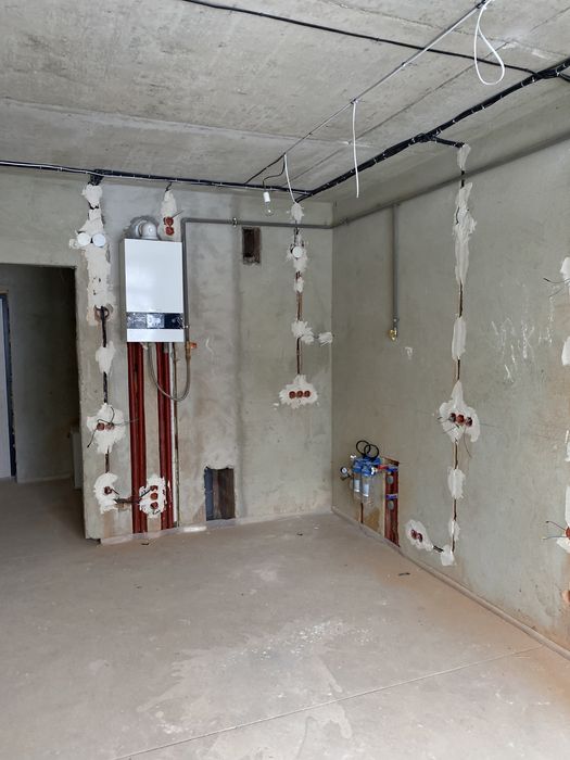 В квартирі розведена електрика, виконані роботи з влаштування піщано-цементної стяжки підлоги, роботи з влаштуванн внутрішньої мережі водопостачання, водовідведення та мережі опалення.
