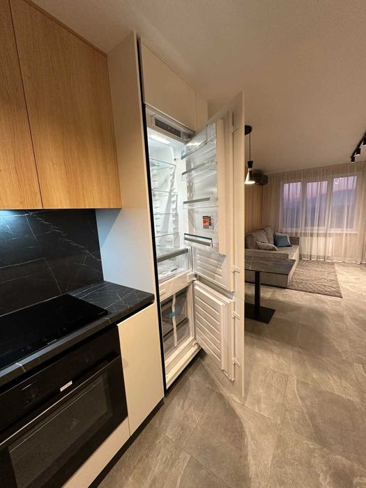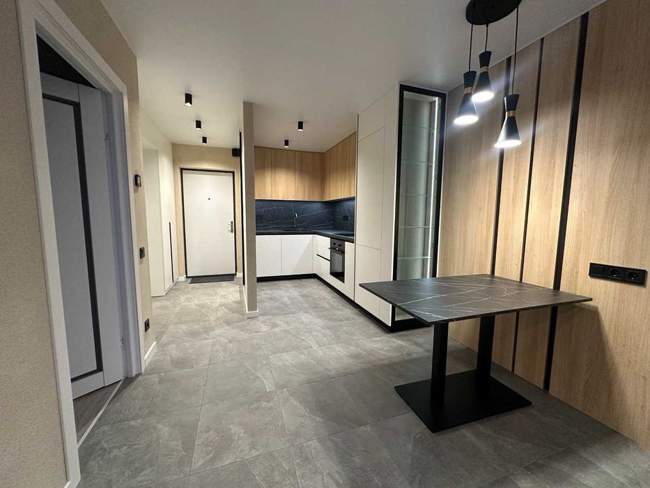 - і вдало зонована містка кухня з вбудованою технікою преміум сегменту, фурнітура blum, якісні матеріали, підсвітка, велика мийка, вбудований великий холодильник.