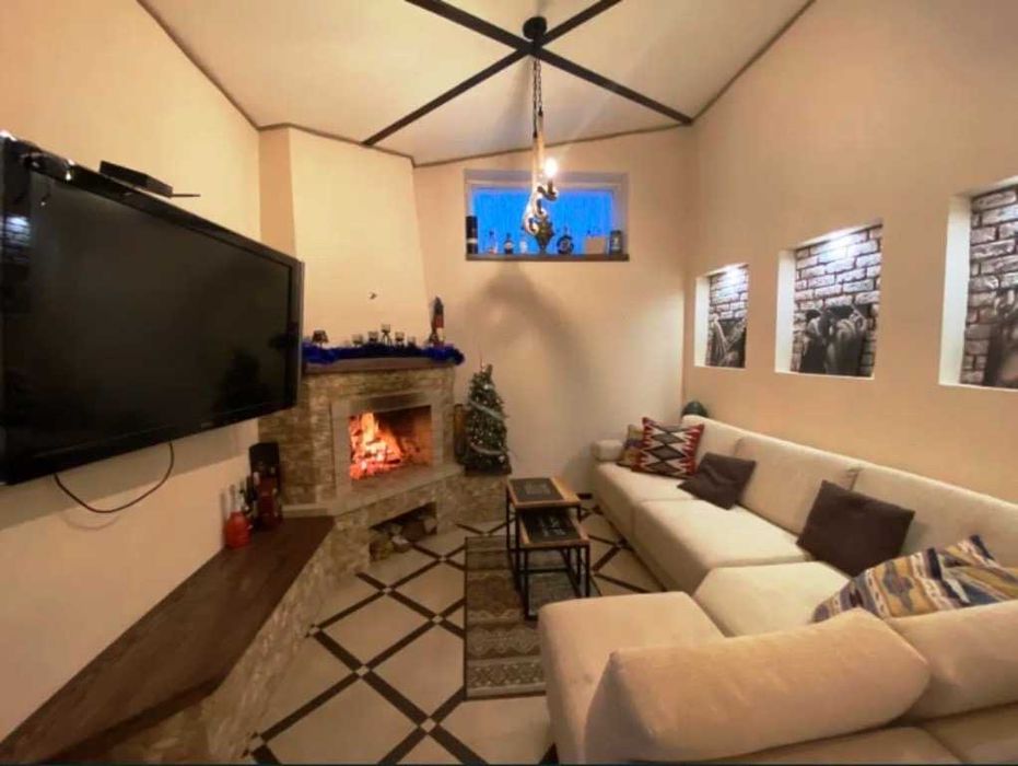 На першому поверсі: прихожа з шафою купе. Велика кухня з коморою. Просторий зал з диваном та ТБ. Вихід на терасу з великим газоном. А також велика кімната з дровяним каміном, столом, ТВ-плазмою та кутовим диваном для теплих зустрічей із гостями. Та підсобне приміщення.