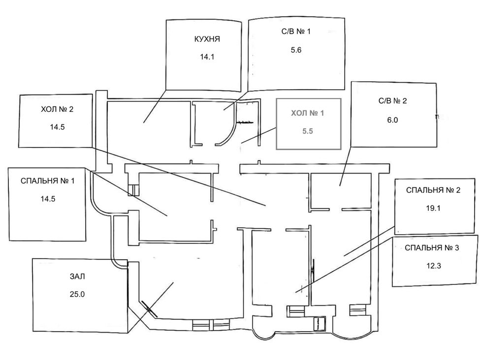 Планування 4 кімнатнатної квартири : зал 25 м. Кухня 17 м. 3 окремих спальні (19 м, 14.5 м, 12.3 м) , у кожній кімнаті балкон-лоджія (засклені), 2 окремі санвузла.