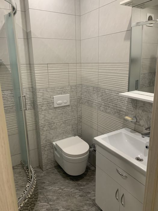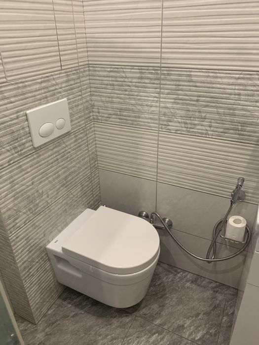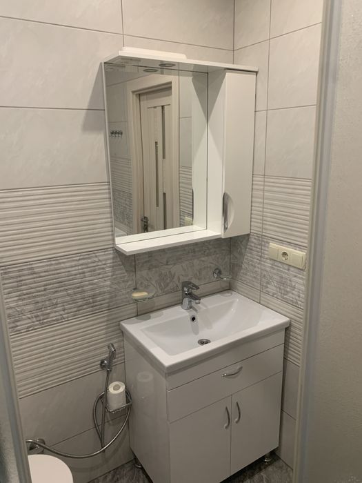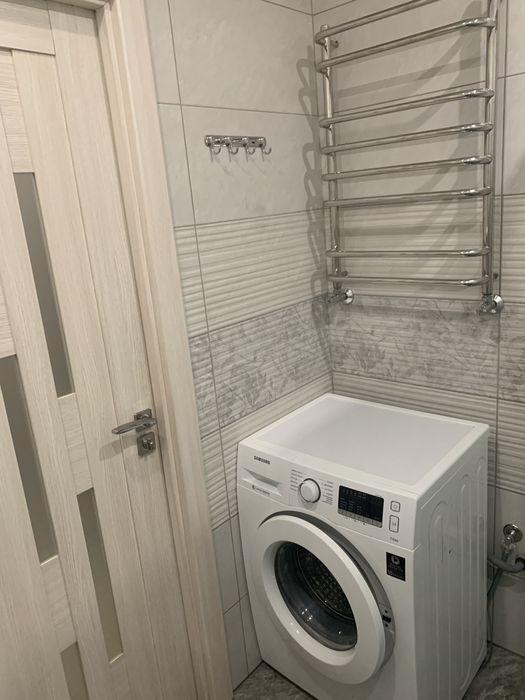 У ванній кімнаті душова кабіна з душовою системою,інсталяція унітаз з гігієнічним душем, умивальник з тумбою з дзеркалом з шафою, велика пральна машина, пилосос сушка для білизни, гладільна дошка, праска, рушникосушка, витяжка.