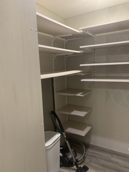 Окрема гардеробна ,з полками і вішаками і тумбою.