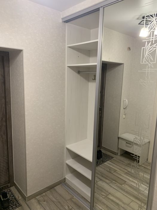 Передпокій з шафою купе з дзеркалами і і пуфіком на який можна присісти.