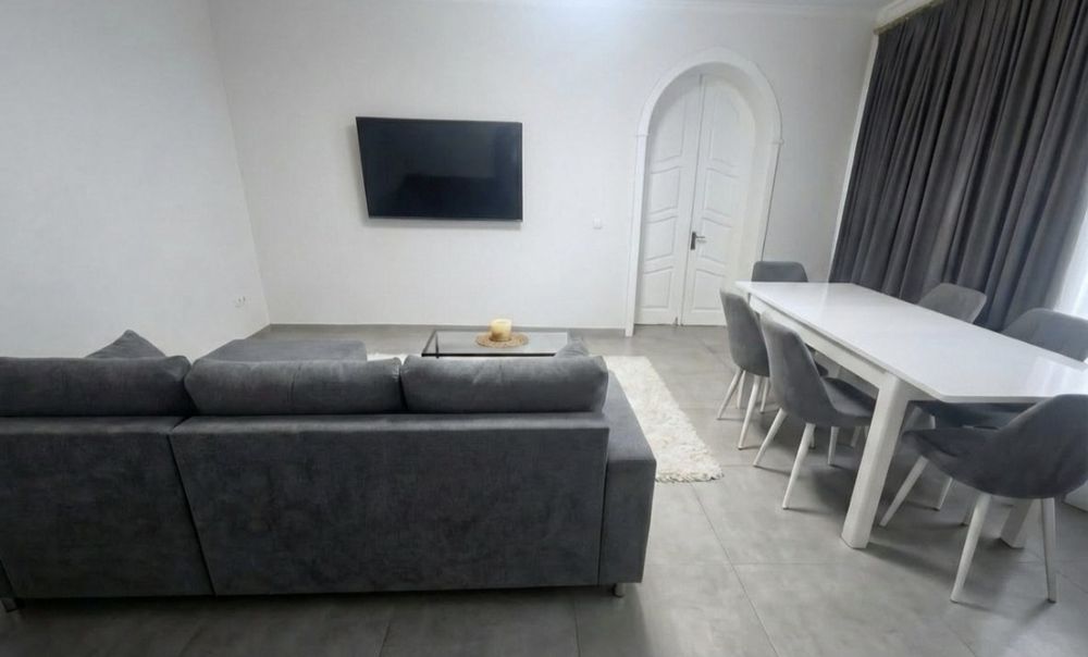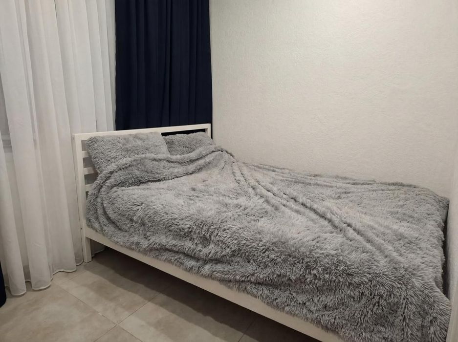 Двери из натурального дерева с отличной шумоизоляцией, единый пол из керамогранитной плитки без порожков, стены из декоративной штукатурки, шторы блэкаут во всех комнатах, кронштейны под телевизоры в зале и спальне.
