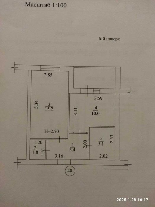 Общая площадь 40 м2, комната 15,2 м2, просторная кухня 10,00 м2, коридор 5,4 м2, лоджия 2,4 м2, ванная 5,1 м2, каморка 1,8 м2.