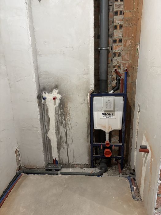 - розведена вода та каналізація, змонтовано душовий трап; інсталяція Grohe для підвісного унітазу;