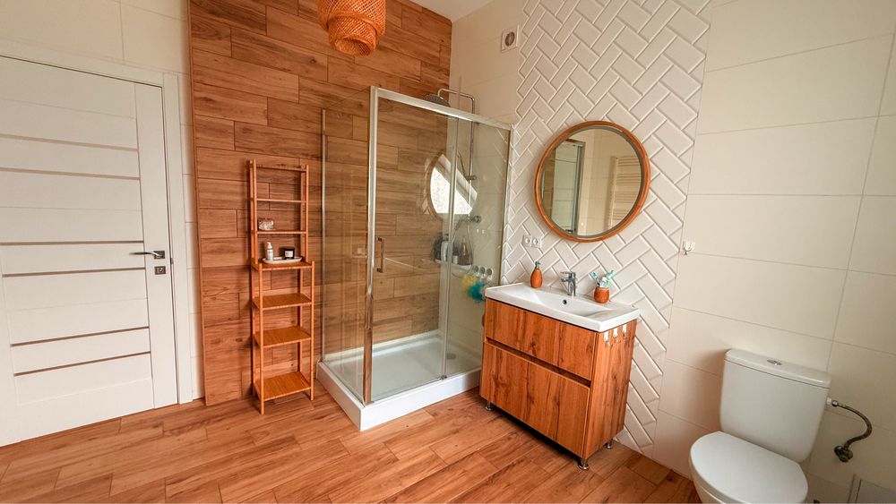 Будинок просторий та світлий, високі стелі та свіжий ремонт робить проживання комфортним та приємним. В кожному приміщення є вентиляція, встановлено фільтри грубої очистки на воду та зворотній осмос, проведено інтернет (меш система на всі поверхи) та сигналізація, система відеонагляду, у вітальня дуже простора та світла з каміном, який дозволяє її також обігріти. Котел конденсаційний на опалення та воду один з найдорожчих та економних (~2тис$), в кожній кімнаті встановлене регулювання температури з можливістю керувати дистанційно/встановлювати графіки, всюди де є плитка - підігрів підлоги. Будинок теплий і при тому розхід газу є не великим. Зроблено вивід під генератор (новий генератор в подарунок), лічильник день/ніч.