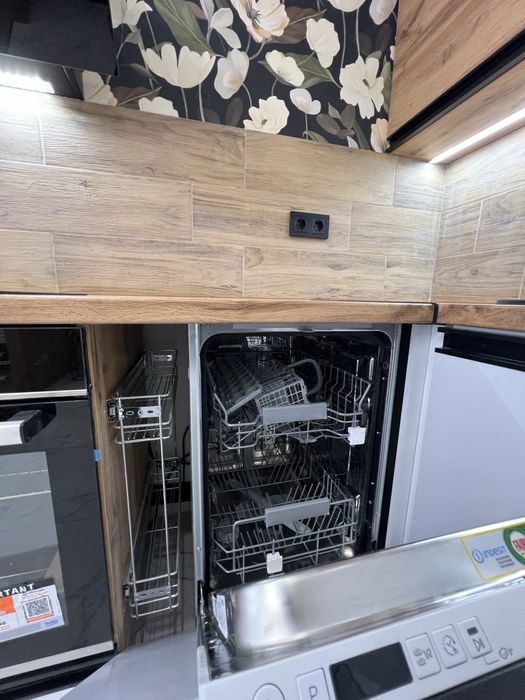Техніка: бойлер, пральна машина, електрична варильна поверхня, духова шафа, дизайнерська витяжка, холодильник, посудомийка.