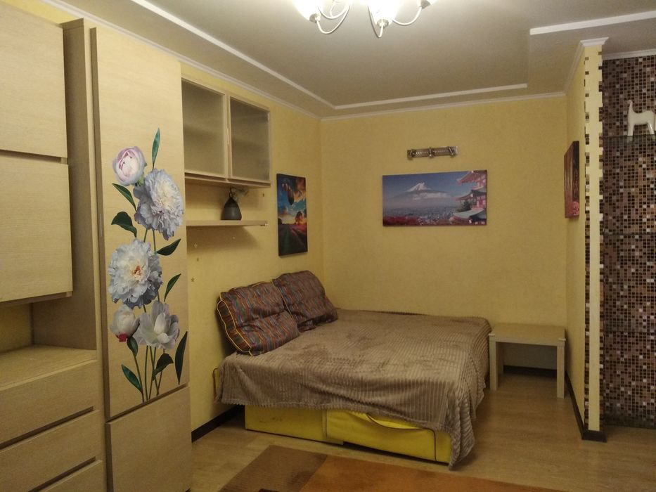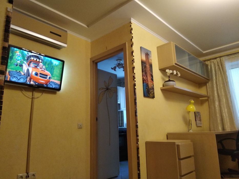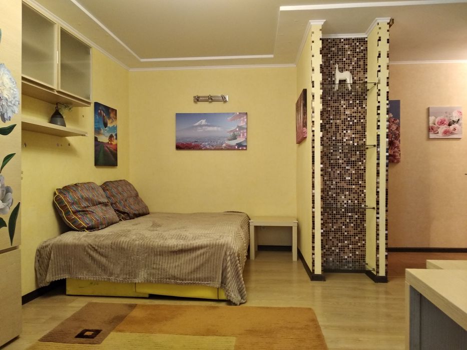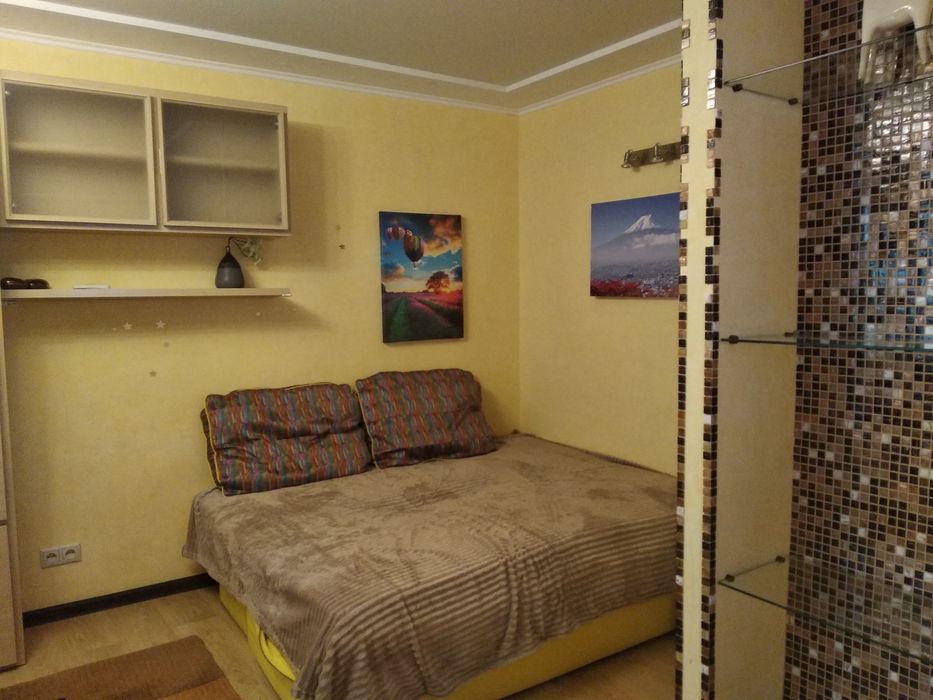 На підлозі: ламінат, кахель. У кімнаті великий розкладний диван (1,6м х 2,0м).