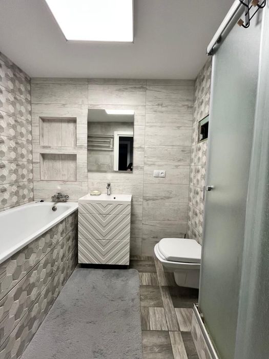 Санвузол суміщений. У ванній кімнаті є ванна, душ та туалет, виконані в сучасному стилі.