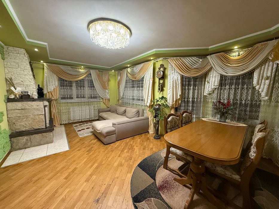 Простора кухня, обʼєднана вітальня з столовою та камінною зоною.