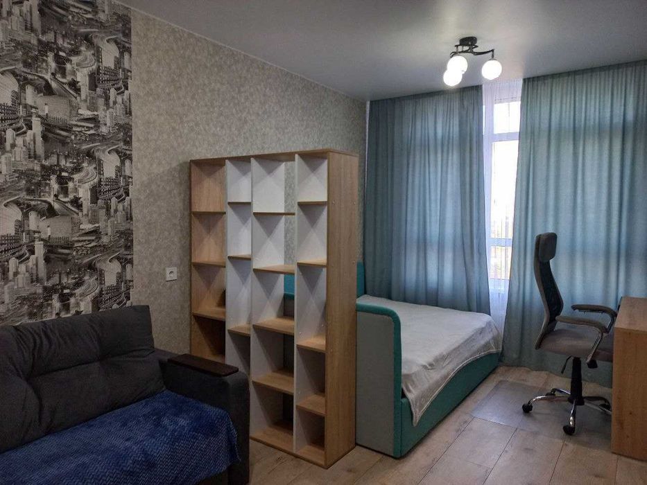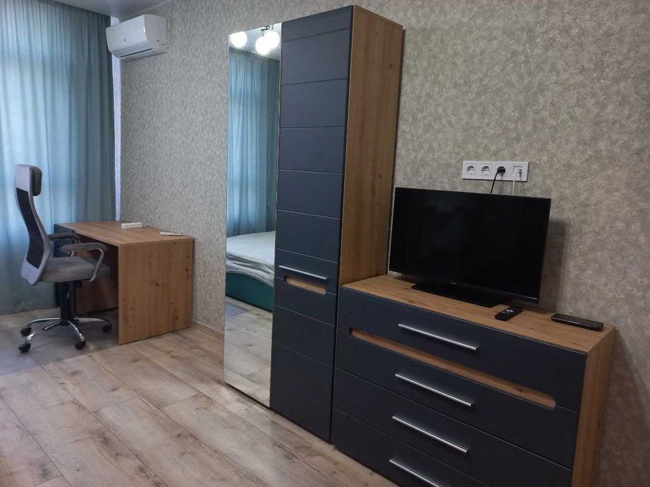 Світла та затишна квартира з усім необхідним для комфортного проживання: двоспальне ліжко (140×200), розкладний диван, робоче місце зі столом, інверторний кондиціонер, телевізор, Wi-Fi роутер.