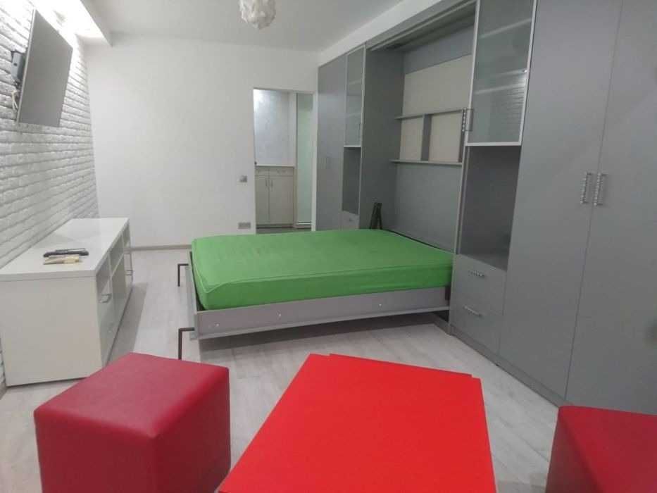 Ідеально підходить для проживання 1-2 осіб. У кімнаті встановлено шафу-ліжко-трансформер (160х200 см), яка вдень ховається у шафу й звільняє простір.