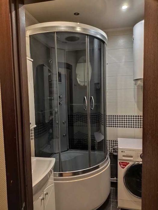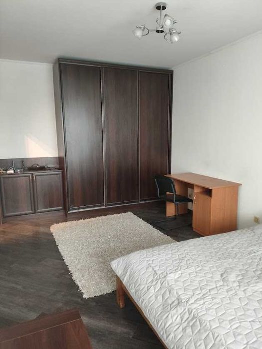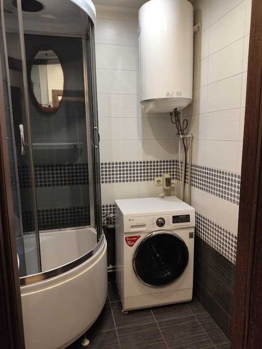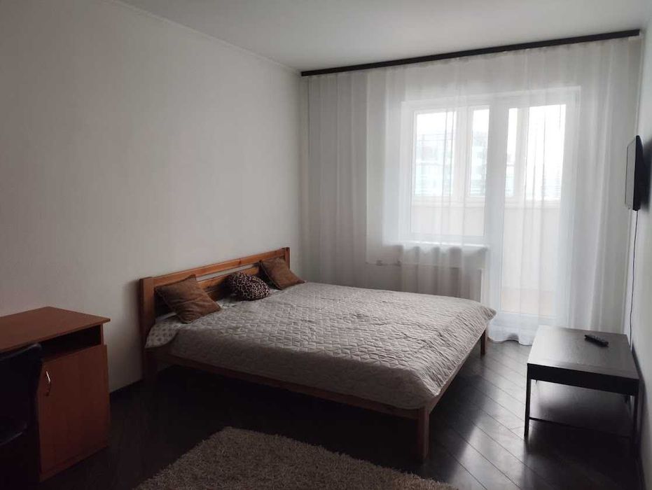 В квартирі: роздільний санвузол, дві великі шафи, двоспальне ліжко, письмовий стіл, холодильник, електроплита, мікрохвильова, пральна машинка, душова кабіна, бойлер, просторий балкон.