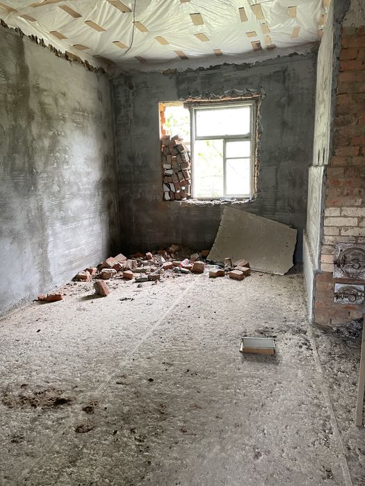 В двох кімнатах залита стяжка та поштукатурені стіни є грубка