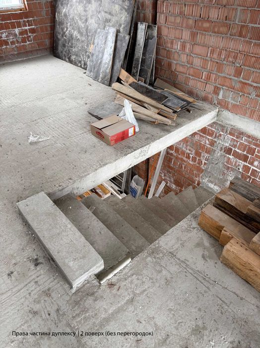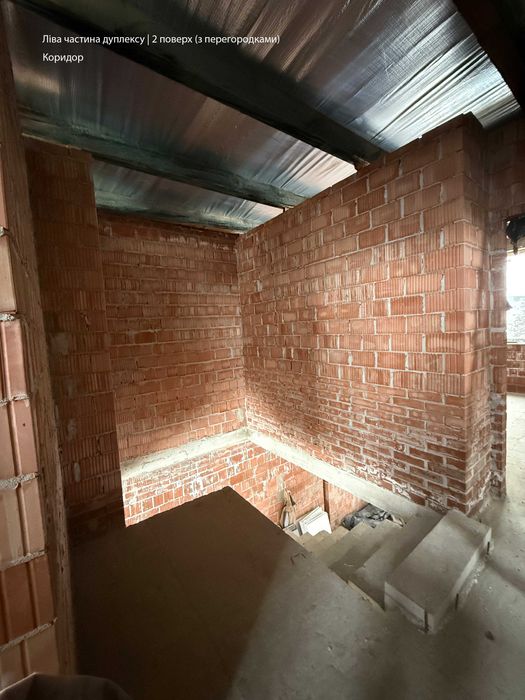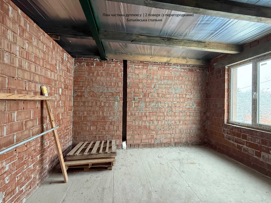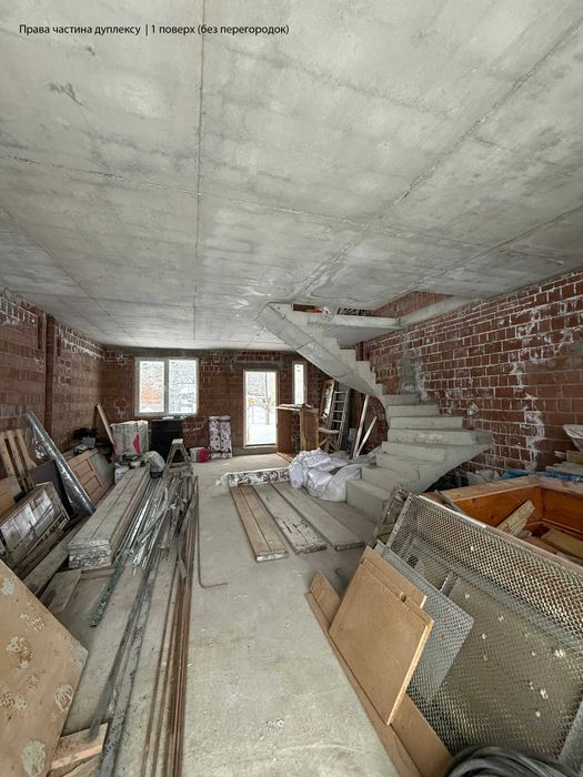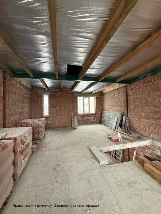 • Ліва частина дуплексу: 1-й поверх — без перегородок (по проекту: вхідна зона, санвузол, кухня-вітальня, кабінет); 2-й поверх — вимурувані перегородки (батьківська спальня з гардеробом, санвузол та велика дитяча, яку можна розділити на дві окремі дитячі кімнати).