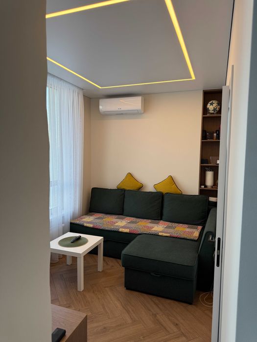 Перепланована 2-кімнатна квартира у євротрьошку: кімната 18 кв. м з двома вікнами поділена на спальню (10 кв. м) і вітальню (8 кв. м) з диваном і ТВ (див. фото).