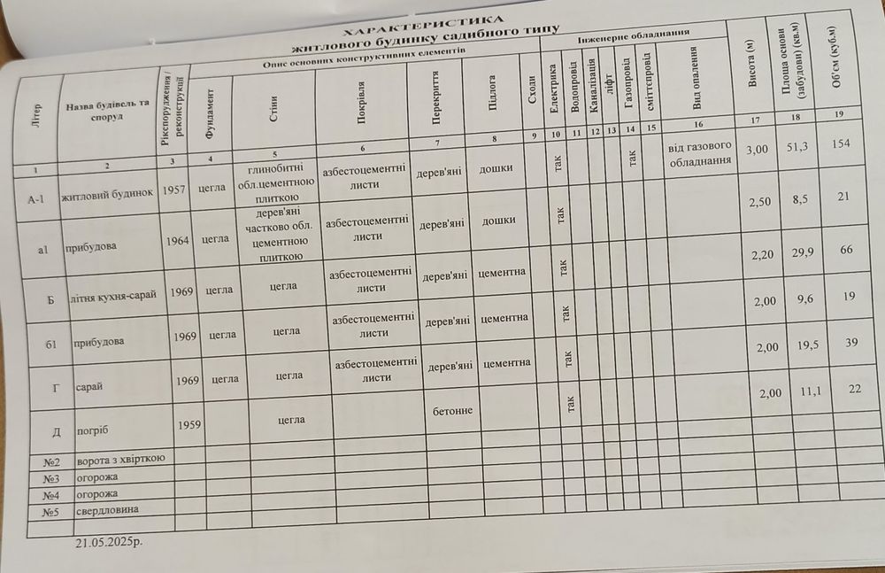 На території ділянки знаходиться житловий будинок 51м², погреб зі сходами, дві погребні ями, літня кухня, два сарая для введення господарства, сад фруктових дерев та винограду. Від дороги встановлений новий паркан на два заїзди.