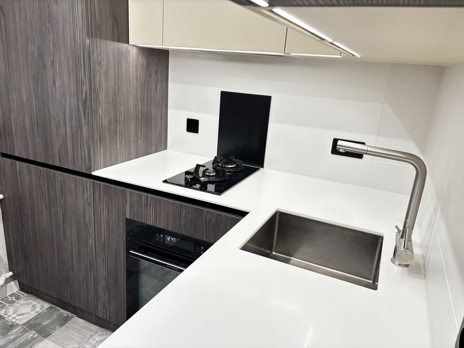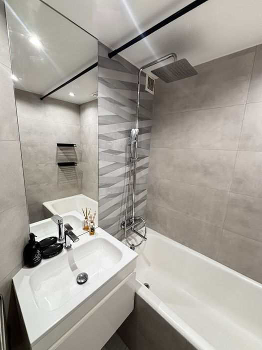 Новий якісний ремонт у сучасному стилі зроблений 1 рік тому. Встановлені стильні міжкімнатні двері. Якісне підлогове покриття. Вбудована кухня з технікою. Сучасні меблі ( Духова шафа електрична, газова плита, витяжка, пралка, бойлер, холодильник, кондиціонер) Місткі шафи для зберігання.