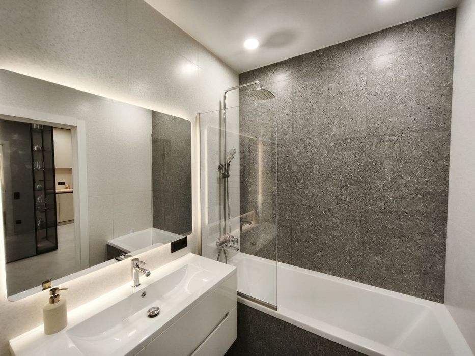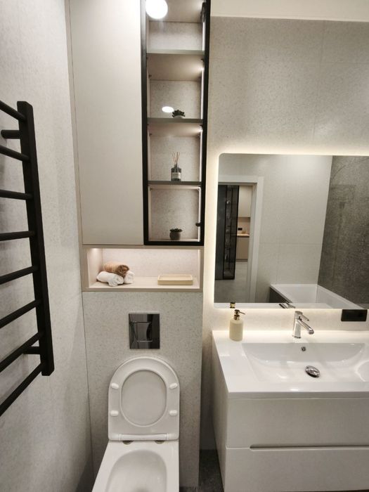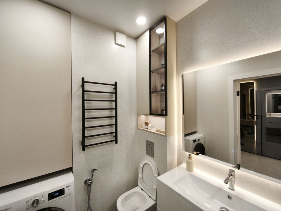 Сан вузол: ванна з підсвіткою, інсталяція, дзеркало с під світкою, сушарка для рушників, бойлер на 80 л. з двома сухими тенами, великий умивальник, ванна та гігієнічний душ, пральна машина, сушильна машини