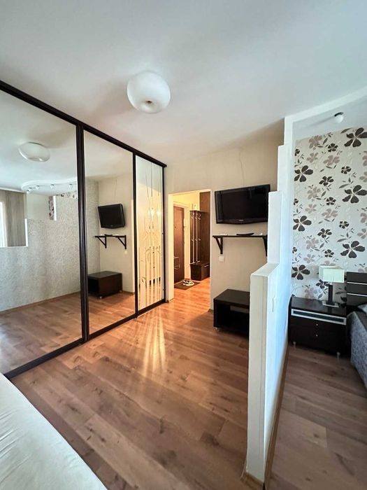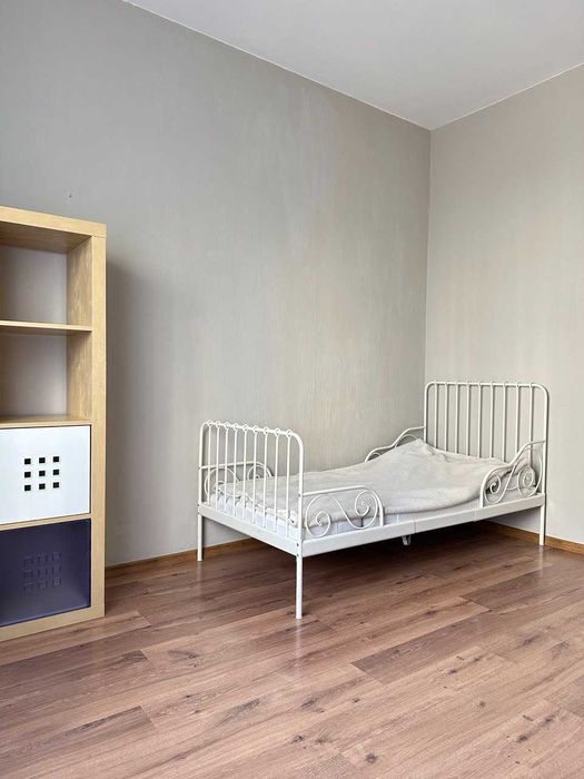 Оскільки, в певний момент у нас стало двоє дітей, то довелося спальню віддати під дитячу кімнату, а самим переїхати у велику кімнату. В процесі ремонту велика кімната була поділена на 2 частини: спальна кімната і зона ТБ (на фото видно). Це виявилося найкращим рішенням, з'явилась можливість установки повноцінного ліжка з нормальним матрацом, а у ТБ зоні додатковий розкладний диван для гостей.