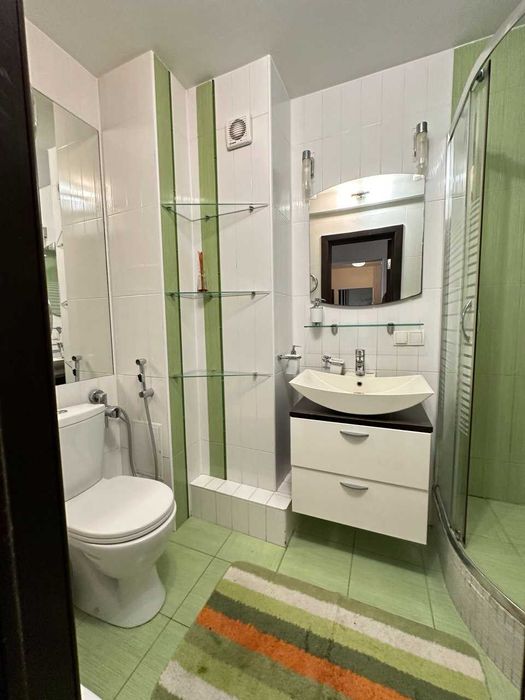 Унітаз з гігієнічним душем, умивальник з тумбою, душова кабіна і пральна машина автомат, бойлер для нагріву води.
