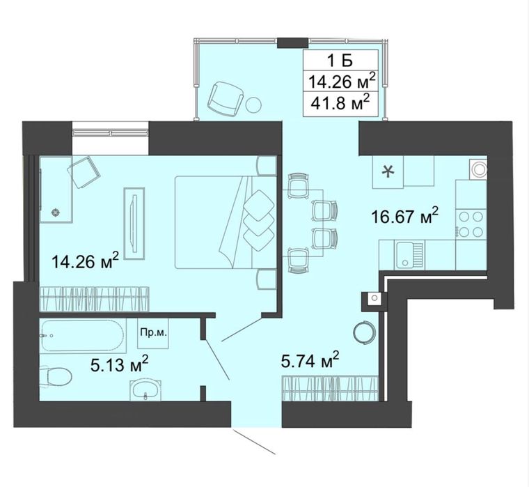 Фактична площа 44.3м.кв