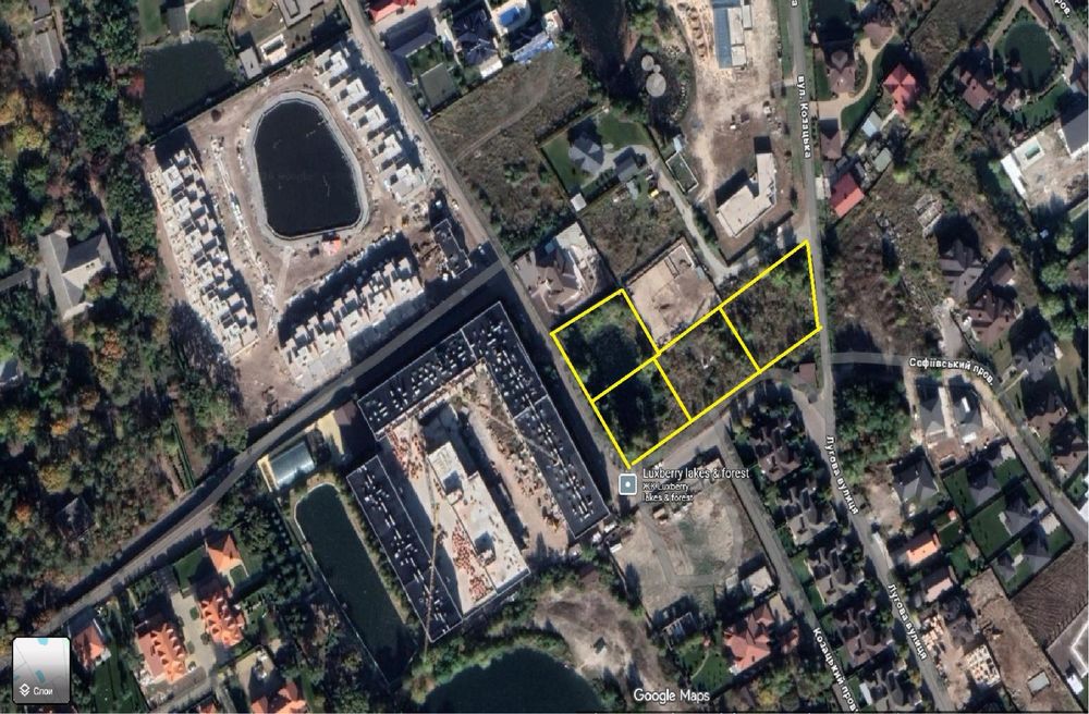 Ділянка 4 ділянки по 15 сот під забудову(60сот); Чудове місце в центрі Конча Заспи. Асфальтований підʼїзд з двох сторін. Може бути прямий виїзд на Столичку під шлагбаум.