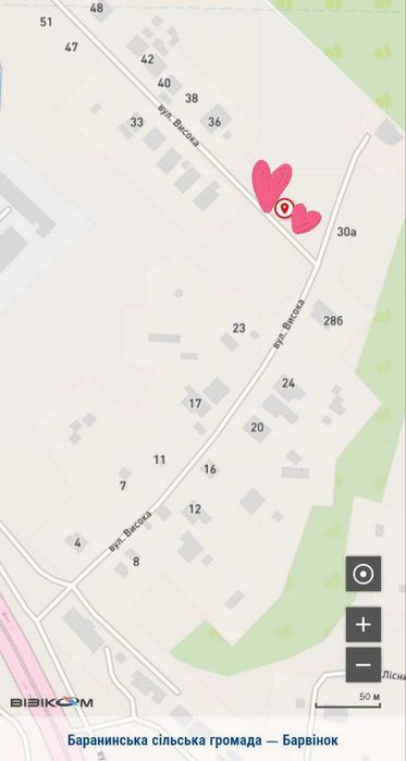Земельна ділянка під житлову забудову 11,5 сот Барвінок; Пропонується до продажу земельна ділянка площею 11,5 сотки (шир. ~62 м, довж. ~18 м) для будівництва й обслуговування житлового будинку. Розташування: село Барвінок, вулиця Висока.