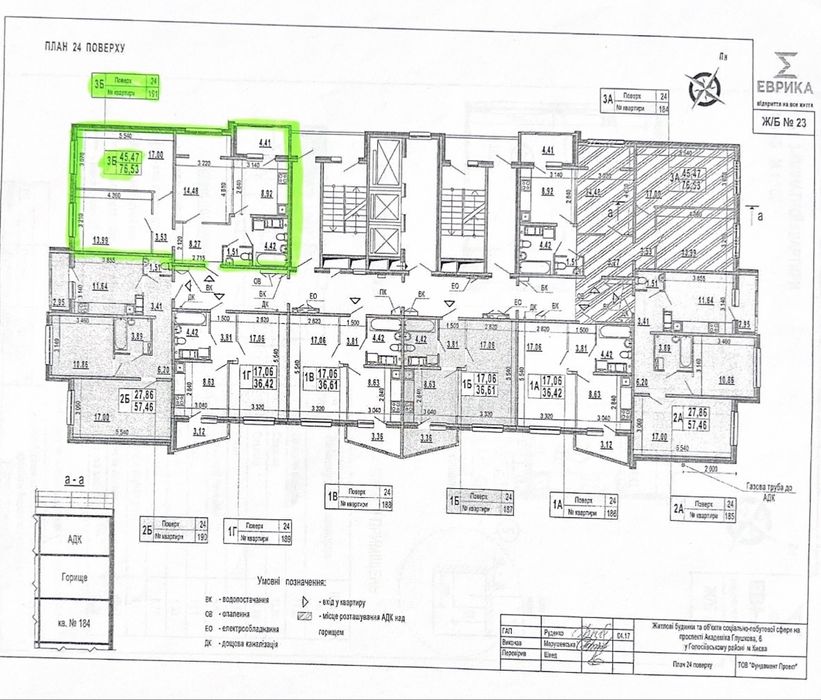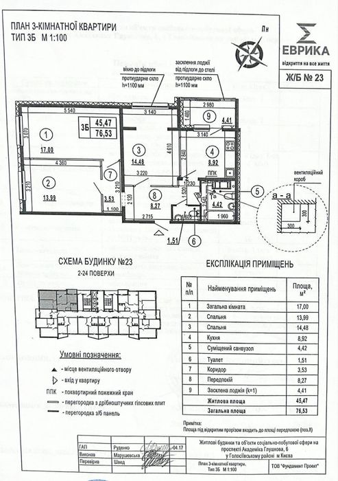 Голосіївський; Продам 3к 76 м2 буд. №23 ЖК Еврика; Продам 3к квартиру в будинку №23 ЖК «Еврика». Площа – 76.53 м2. Поверх 24 (вище є ще повноцінний технічний поверх).