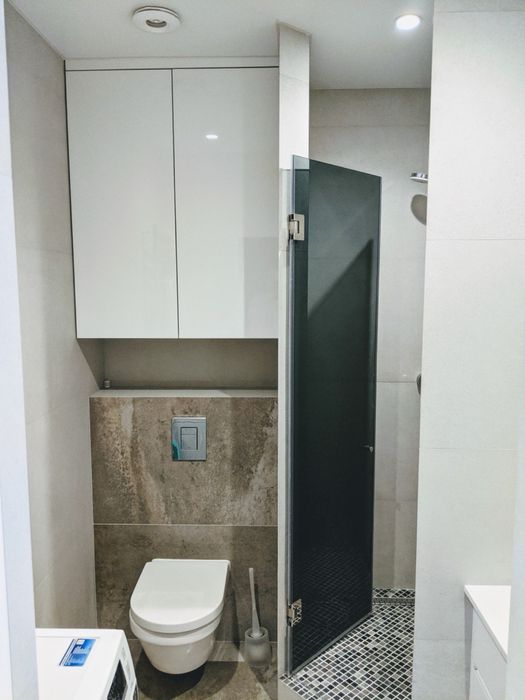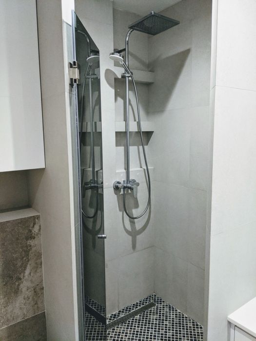 У ванній кімнаті - душова кабіна, тумба та дзеркало з підсвіткою, витяжка, сушка для рушників.