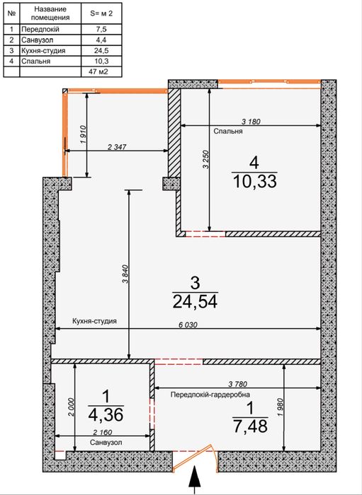 Загальна площа 47 м². 3/9 поверх.