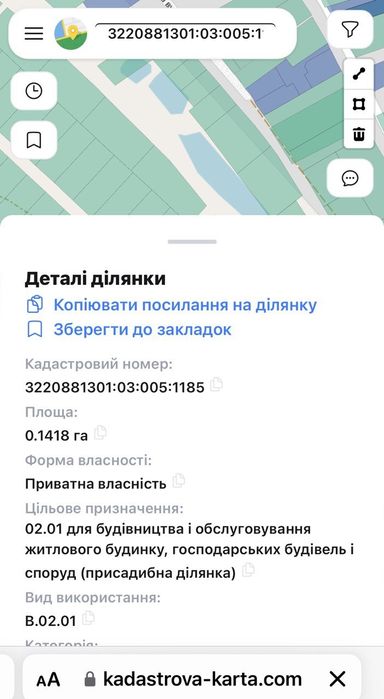 - Кадастровий номер: 3220881301:03:005:1185 (все прозоро, форма власності приватна, документи готові).