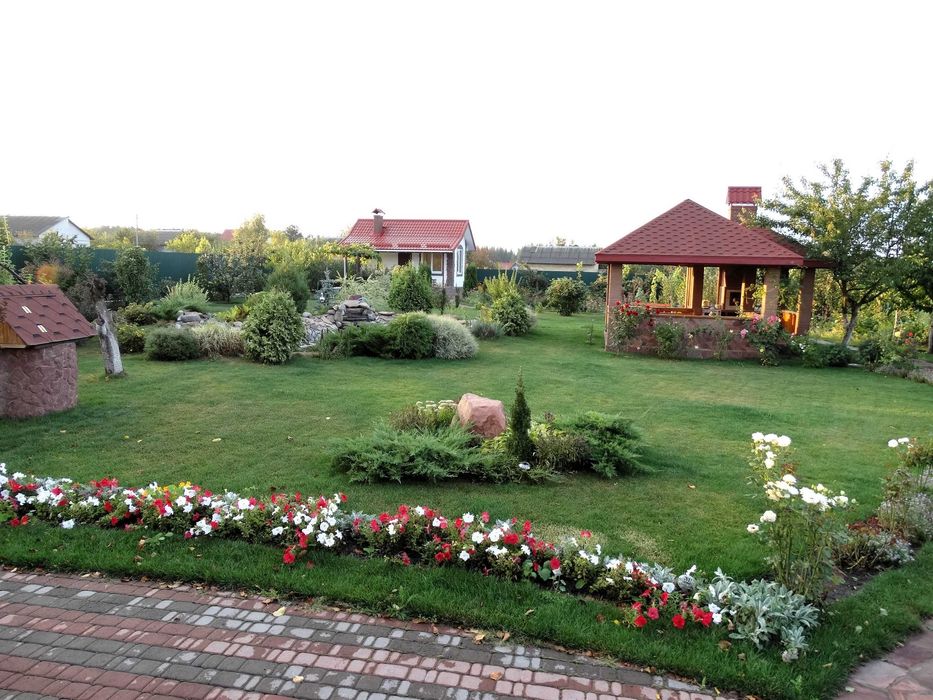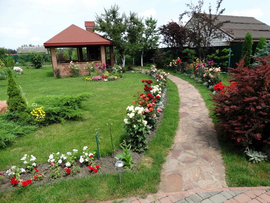 Також ділянку прикрашають клумби з різноманітними квітами та декоративними рослинами.
