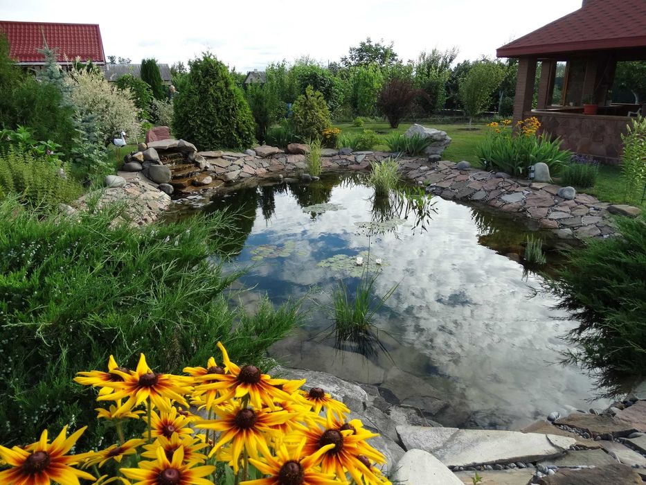 Окрасою ділянки є великий ставок з бетонною основою з водними рослинами і декоративними рибами,