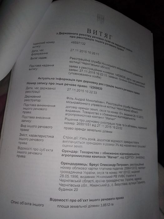 Продам земельну ділянку площею 3.85 і знаходиться в оренді; Продам земельну ділянку площею 3.85 сільського призначення і знаходяться в аренді в Ніжинський район Чернігівська область село Безуглівка в ТОВ агрофірма Магнат; кадастровий номер: есть