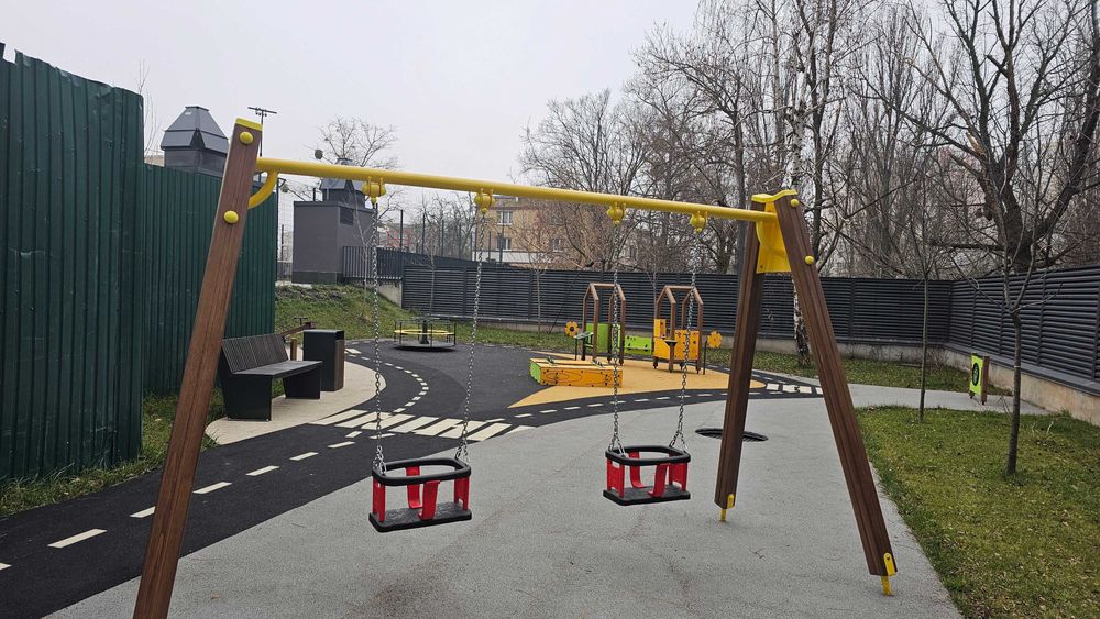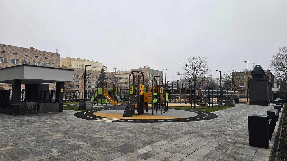 Закрита територія комплексу. Ландшафтний дизайн. Сучасна дитяча площадка, лавочки.