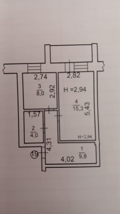 Кімната 15,3 м², кухня 9,8 м², санвузол 4 м², є додаткова кімната/гардероб 8 м².