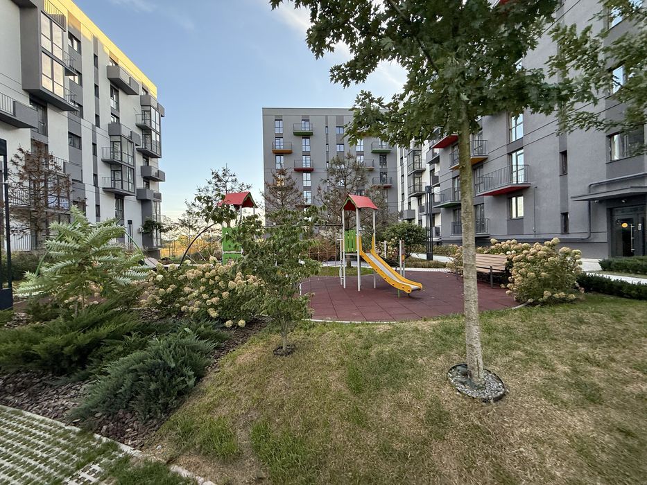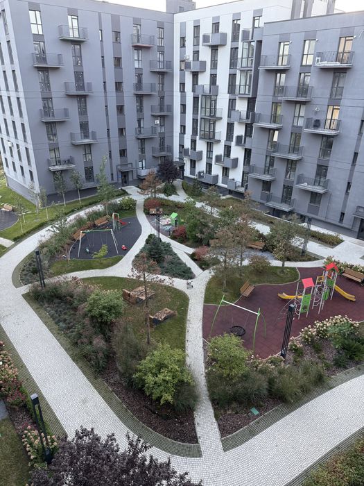 Двір без машин з дит майданчиком і дизайнерським озелененням