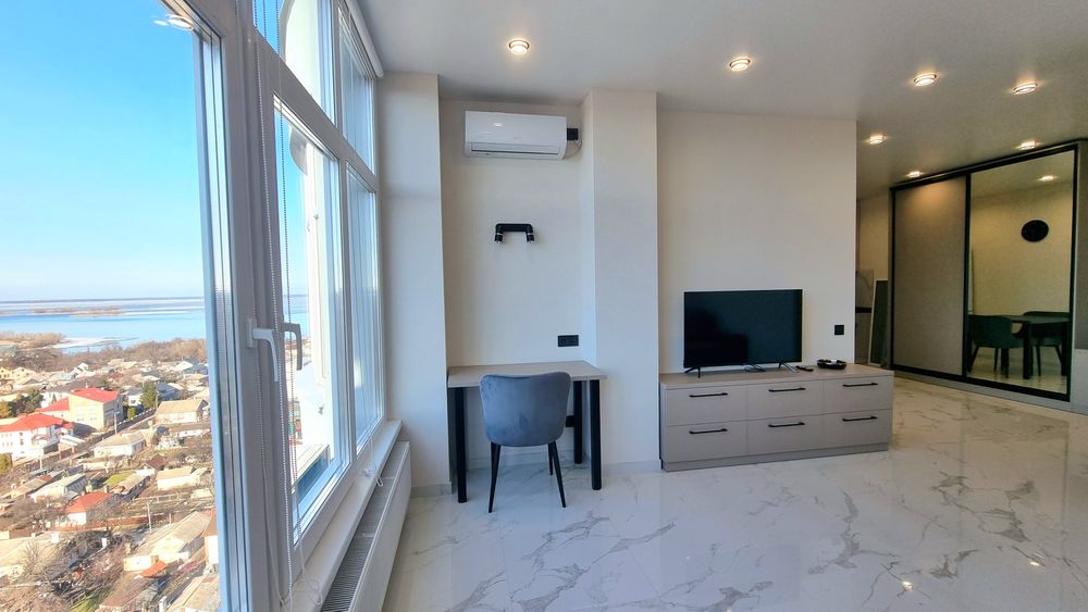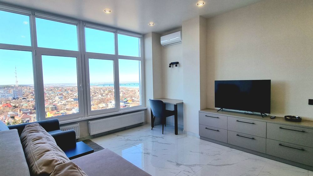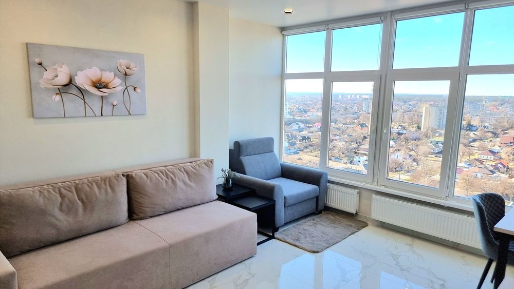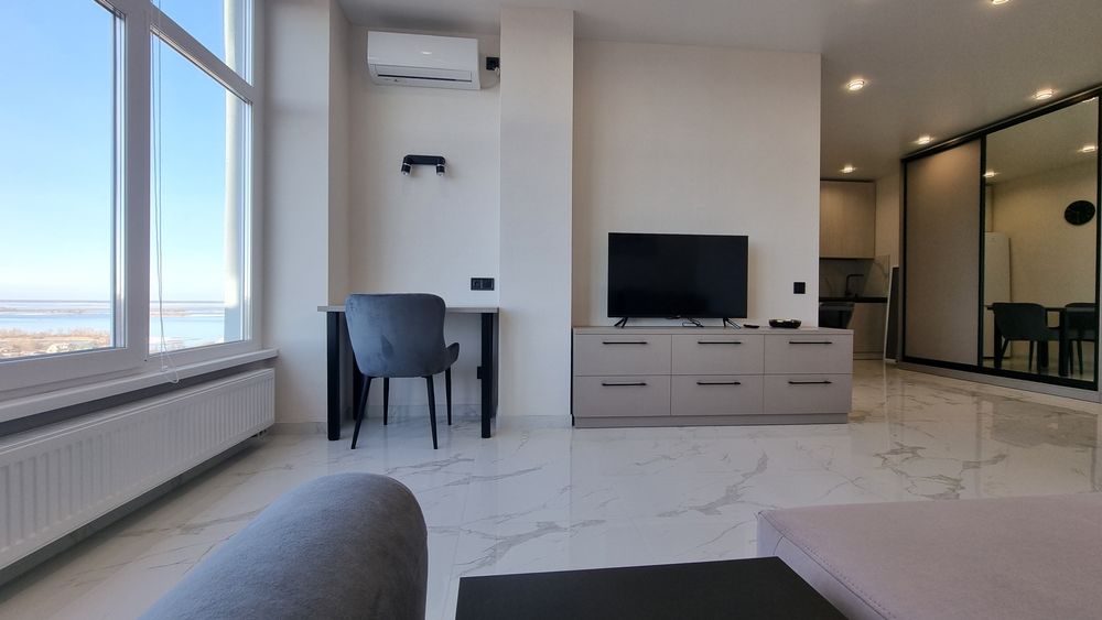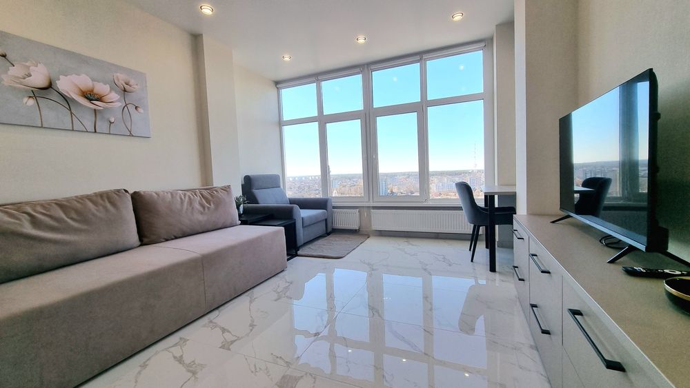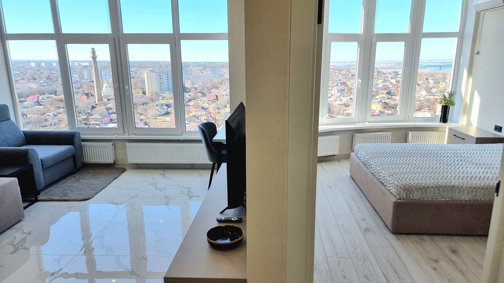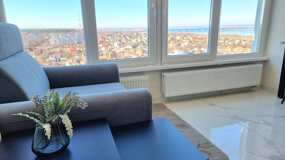 Квартира дуже світла (панорамні вікна; LED-підсвітка кухні).
