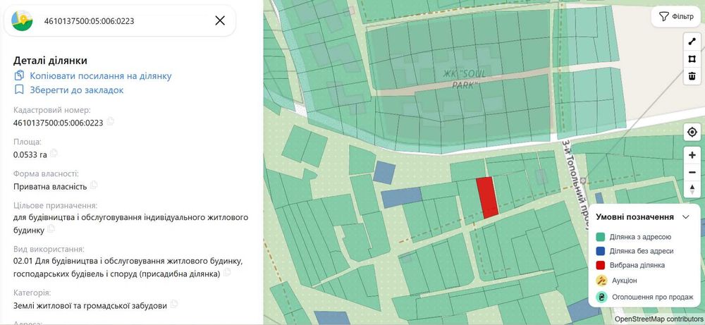 Ділянка розташована безпосередньо поруч із новим житловим комплексом Soul Park від LEV Development, що формує перспективну зону активної забудови.