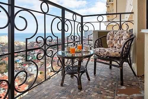 Балкон с садовой мебелью сидя на которой можно наслаждаться видом моря.